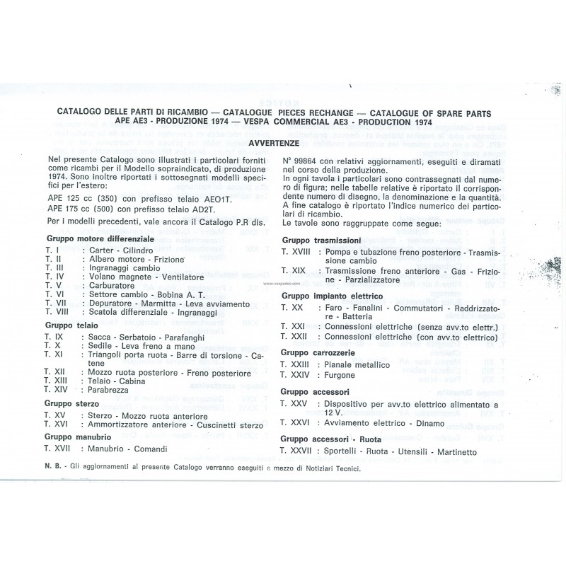 Ersatzteil Katalog Piaggio Ape E 175 AE3T, Ape 125 AEO1T (350), Ape D 175 AD2T (400), 1974