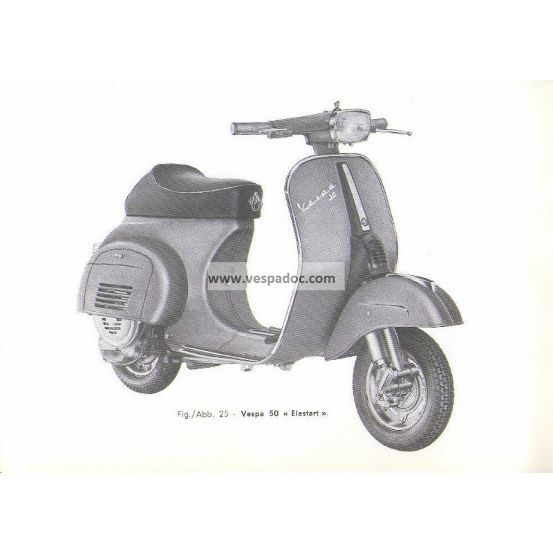 Présentation - Performances et caractéristiques principales – Commandes et transmissions – Instruction pour l'usage immédiat – Rodage – Pression pneus - Entretien : opérations courantes – Récapitulation des normes d'entretien – Anomalies de fonctionnement – Moteur : Description – Châssis : Description – Accessoires – Installation électrique – Données pour l'identification – Caractéristiques spécifiques Vespa 50 Elestart