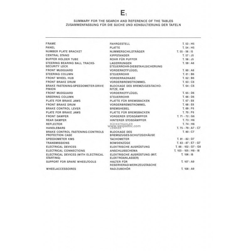Moteur – Carter – Fixations carter – Fixations carter, Collection de joints – Roulement – Vilebrequin, Ensemble bielle, Maneton – Ensemble Cylindre, Piston, Axe de piston – Culasse, Coiffe – Raccord d'admission – Poulie motrice – Poulies, Couvercle poulies - Embrayage – Couvercle canalisation – Arbre de poulie entrainée – Cloche de régulation, Piston hydraulique – Dispositif antagoniste du régulateur et du comm. Des gaz – Engrenage multiple, Pompe à huile – Arbre roue, Kickstarter – Tambour du frein arrière – Volant magnétique – Dispositif allumage électronique – Mélangeur automatique – Démarreur électrique – Filtre à air – Carburateur – Pot d'échappement – Coffre à l'avant – Abattants – Coffre latéral – Catadioptre – Cylindre et clefs pour serrures – Cache direction – Selle “Turismo” - Selle biplace – Réservoir – Robinet du mélange – Réservoir d'huile – Profils, Tapis – Châssis – Panneau – Support plaque police – Béquille – Tube porte silentblocs – Sièges direction, Antivol – Garde-boue avant – Tube de direction – Moyeu roue avant – Tambour frein avant – Levier commande frein avant – Amortisseur avant – Amortisseur arrière – Guidon – Boîte protection commandes – Ancrage frein, Engrenage compteur kilométrique – Garde-boue avant – Tube de direction – Disque pour mâchoires de frein – Tambour frein avant – Levier commande frein - Disque pour mâchoires de frein – Amortisseur avant – Amortisseur arrière – Catadioptre – Guidon – Blocage frein, Boîte protection – Commandes – Compteur kilométrique – Transmissions – Dispositif électrique – Branchements électriques – Dispositif électrique (avec démarreur électrique) – Support roue de secours, Outils – Roue, Accessoires