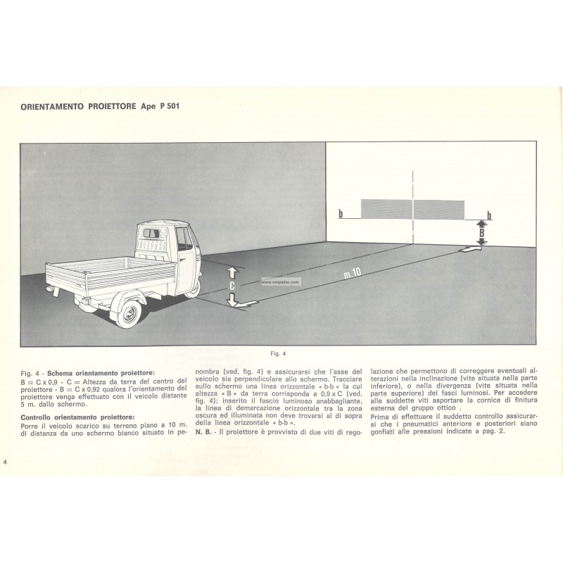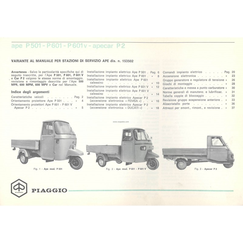 Caratteristiche veicoli – Orientamento proiettore Ape P501 - Orientamento proiettore Ape P601, P601V, Apecar P2 – Installazione impianto elettrico Ape P501 - Installazione impianto elettrico Ape P601 - Installazione impianto elettrico Ape P601 Calessino - Installazione impianto elettrico Ape P601V - Installazione impianto elettrico Ape P601V Calessino - Installazione impianto elettrico Apecar P2 (accensione elettronica “Femsa”) - Installazione impianto elettrico Apecar P2 (accensione elettronica “Ducati”) – Comandi impianto elettrico – Accensione elettronica – Gruppo generatore e regolatore di tensione – Giochi di montaggio – Caratteristiche e messa a punto carburatore - Norme generali di manutenzione e lubrificazione– Tabella coppie di bloccaggio – Revisione gruppo sospensione anteriore – Alzacristallo porte – Attrezzi per smontaggio, rimontaggio e revisione