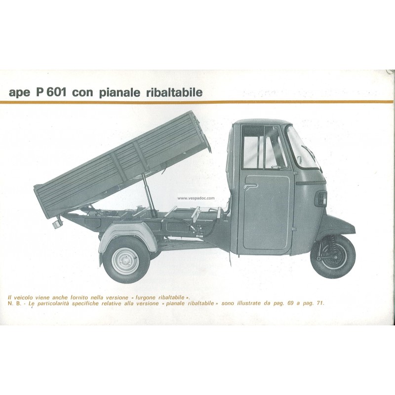 Versioni e modelli –Descrizione del veicolo – Caratterist. E prestaz. – Candela – Dati matricolari – Install. comandi in cabina – Norme per l’uso – Pressione pneumatici – Rifornimento – Rodaggio – Impianto elettrico – Avviamento, Partenza, Cambio marce – Frenatura, retromarcia – Arresto motore – Climatizzazione – Cambio ruote e pneumatici – Schema freni – Schema dispositivo riscaldamento in cabina – Manutenzione – Sostituzione cartuccia filtrante – Registrazione freni – Controllo orient. Proiettori – Manutenzione periodica – Norme per la pulizia del veicolo – Lunga inattività – Tabella per la lubrificazione e manutenzione periodica – Anomalie di funzionamento – Ape P601V – Ape P501 – Veicoli con pianale ribaltabile
