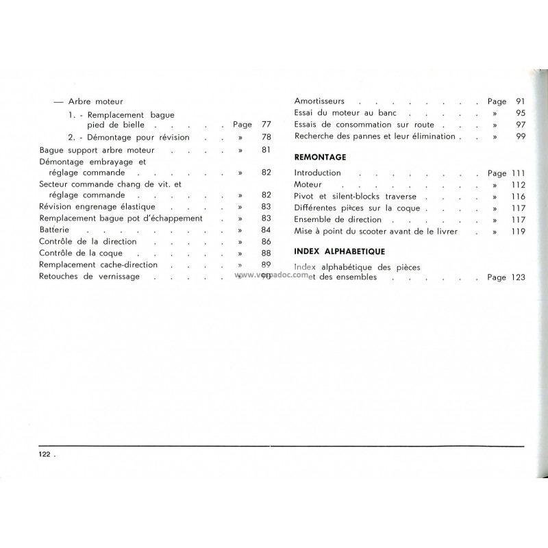 Jeux de montage – Révision Ensembles – Recherche des pannes et leur élimination : Introduction – Tableaux des jeux – Volant magnétique : Remplacement de la came, Aimantation du rotor, Révision du disque porte-bobines, Essai au banc du volant – Arbre moteur : Remplacement bague pied de bielle, Démontage pour révision – Bague support arbre moteur – Démontage embrayage et réglage commande – Secteur changement de vitesses et réglage commande – Révision engrenage élastique – Remplacement bague pot d'échappement – Batterie – Contrôle de la direction – Contrôle de la coque – Remplacement cache-direction – Retouches de vernissage – Amortisseurs – Essai du moteur au banc – Essais de consommation sur route – Recherche des pannes et leur élimination