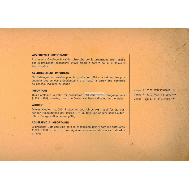 Catalogo de piezas de repuesto Scooter Vespa PX 125 VNX1T, Vespa PX 150 VLX1T, Vespa PX 200 E VSX1T, 1981