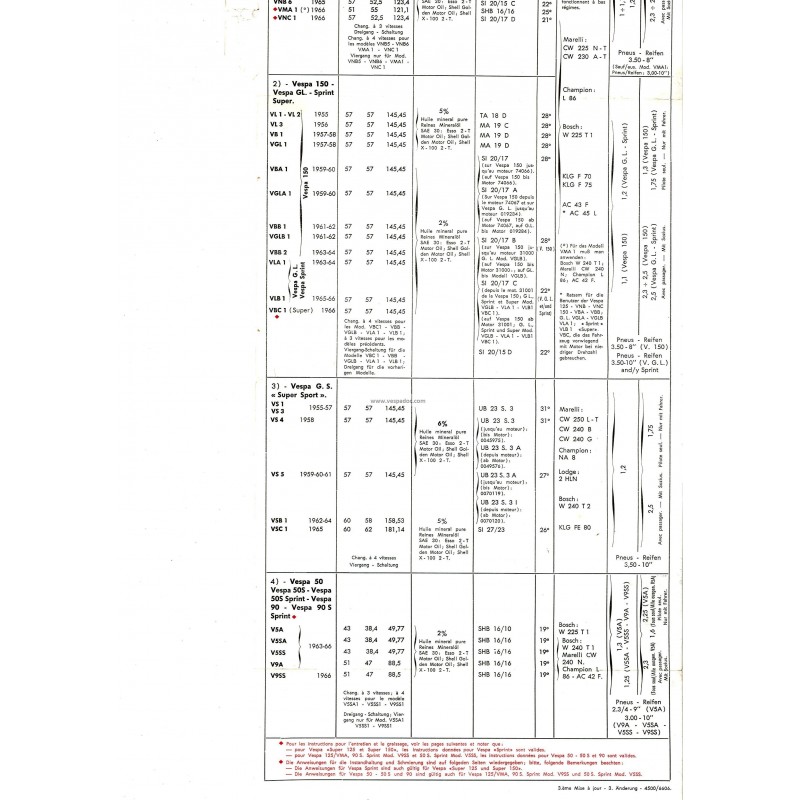 Révisions : Substitution came du volant – Substitution du moyeu du volant et groupe volant-turbine Vespa G.S – Révision stator volant magnétique – Magnétisation du stator – Essai et calage du volant magnétique – Contrôle du redresseur – Changement de vitesses (levier, secteur, réglage comm.) - Embrayage (Contrôle et réglage des commandes) – Substitution de la bague du pied de biele – Révision du vilebrequin – Engrenage élastique – Substitution des bagues pour roulement de support – Bague pour roulement arbre engrenages changement de vitesses - Carburateur (Description et mise à point) – Essai du moteur – Substitution tampons élastiques support du moteur – Montage du pivot et tampons au bras de suspension – Substitution du cache-direction – Substitution douille fixation pot d'échappement Vespa G.S – Substitution du manchon du guidon - Amortisseurs – Révision des demi-carters – Peinture - Essai de consommation sur route