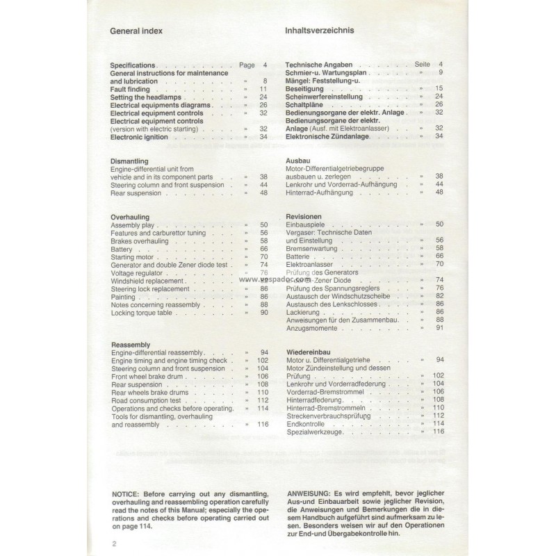Revisionen : Einbauspiele - Vergaser: Technische Daten und Einstellung – Bremsenwartung – Batterie – Elektroanlasser - Prüfung des Generators u. der Bi-Zener Diode - Prüfung des Spannungsreglers - Austausch der Windschutzscheibe - Austausch des Lenkschlosses – Lackierung - Anweisungen für den Zusammenbau - Anzugsmomente .