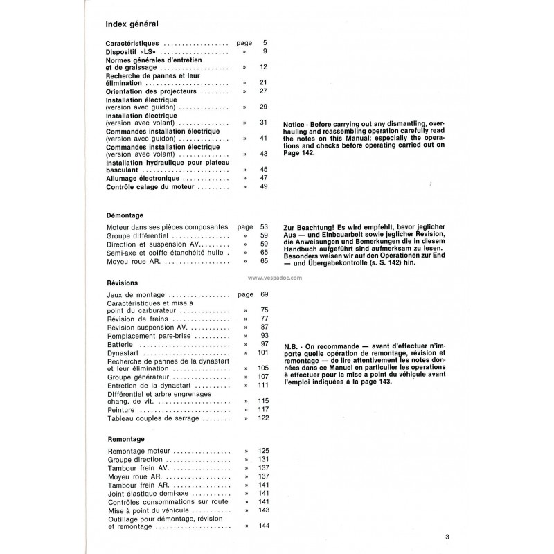 Revisionen : Einbauspiele - Vergaser: Technische Daten und Einstellung - Bremsanlage - Uberholung der Vorderrad- aufhängung - Austausch der Windschutzscheibe – Batterie - AnlaB-Lichtmaschine - Mängel an der AnIaB-Lichtmaschine: Feststellung und Beseitingung - Generator - Pflege der AnlaB-Lichtmaschine - Differentialgetriebe und Schaltwelle - Lackierung - Anzugsmomente