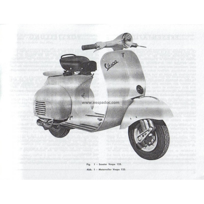 Caracteristiques – Description : Caractéristiques - Normes pour l'identification - Description : Moteur, Commandes, Coque, Suspensions, Installation électrique, Accessoires, Outillage de la trousse – Normes d'emploi et d'entretien : Mélange à employer et rodage, Réglage du ralenti, Graissage, Réglage du phare avant, Réglage des freins, Remisage