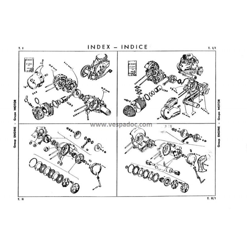 Moteur : Carter, Cylindre – Arbre moteur, Embrayage – Engrenage élastique, Kickstarter – Engrenage du Changement de vitesses, Moyeu roue arrière –Volant magnétique – Carburateur, Filtre à air – Secteur du changement de vitesses, Borne H.T