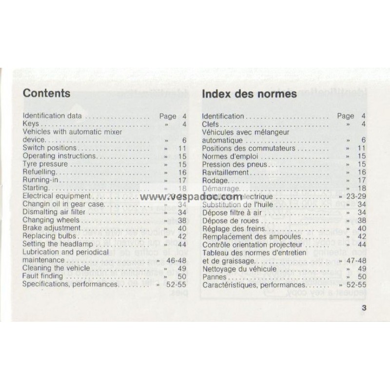 Identification – Clefs – Véhicules avec mélangeur automatique – Positions des commutateurs – Normes d'emploi – Pression des pneus – Ravitaillement – Rodage – Démarrage – Installation électrique – Substitution de l'huile – Dépose filtre à air – Dépose de roues – Réglage des freins – Remplacement des ampoules – Contrôle orientation projecteur – Tableau des normes d'entretien et de graissage – Nettoyage du véhicule – Pannes – Caractéristiques, performances