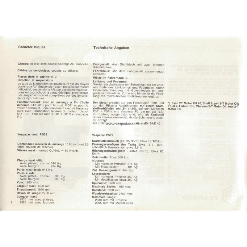 Technische Angaben - Funktionschema der “LS” Vorrichtung für separate Schmierung - Scheinwerfer Einstellung auf Vespacar P501 - Scheinwerfer Einstellung auf Vespacar P601 – P601V – P2 - Schaltplan Vespacar P501 - Schaltplan Vespacar P601 - Schaltplan Vespacar P601 Rikscha Ausf. - Schaltplan Vespacar P601V - Schaltplan Vespacar P601V (Lichthupe) - Schaltplan Vespacar P601V Rikscha Ausf. - Schaltplan Vespacar P2 (Elektronische Zündvorrichtung FEMSA) - Schaltplan Vespacar P2 (Elektronische Zündvorrichtung DUCATI) - Schaltplan Vespacar P2 (doppelte Bremsanlage) - Bedienungsorgane der elektrischen Anlage - Elektronische Zündvorrichtung - Generator und Spannungsregler - Werkzeuge für Ausbau, Wiedereinbau und überholungen – Einbauspiele – Vergaser: Technische Daten und Einstellung – Pflegedienstplan – Anzugsmomente - Revision der vorderen Aufhängung-Guppe - Motorzerlegen: Einscheibekupplung - Scheibenheber