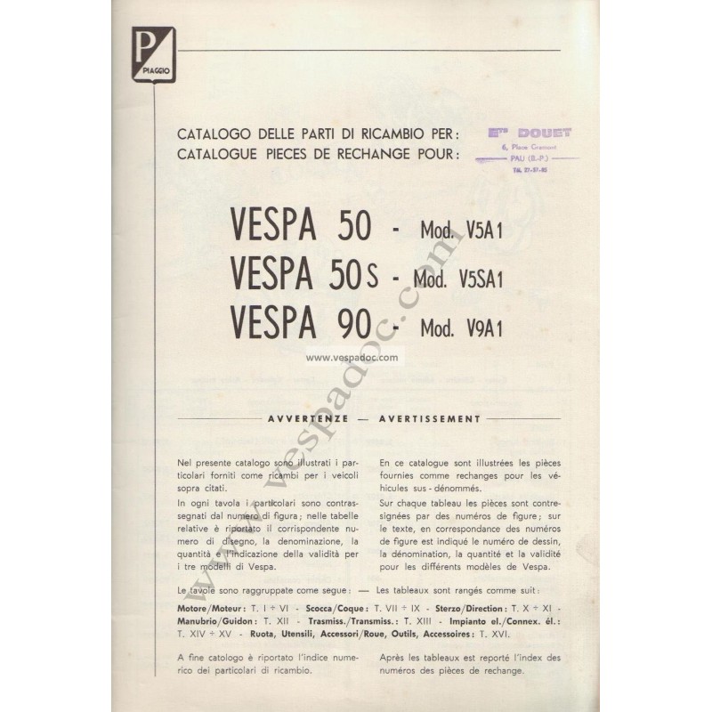Catalogue of Spare Parts Scooter Vespa 50 mod. V5A1T, Vespa 50 S mod. V5SA1T, Vespa 90 mod. V9A1T, French, Italian