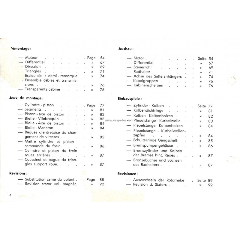 Révisions: Substitution came du volant – Révision stator volant magnétique – Magnétisation du rotor – Essai et calage du volant – Contrôle du redresseur – Démarreur électrique – Dynamo et régulateur – Substitution de la bague du pied de bielle – Révision du vilebrequin – Changement de vitesses (levier, secteur, réglage comm.) - Embrayage (Contrôle et réglage des commandes) – Engrenage élastique – Bague pour roulement arbre engrenages changement de vitesses – Substitution des bagues pour roulement de support – Carburateur (Description et Mise à point) – Essais du moteur – Substitution coussinet, bague et support des demi-axes – Substitution tampons élastiques de l'essieu et du support plateau de jonction motrice semi-remorque du Pentaro – Substitution axe de moyeu de la roue du Pentaro – Révision du frein hydraulique – Amortisseurs – Remplacement cache-direction – Essai de consommation sur route – Peinture